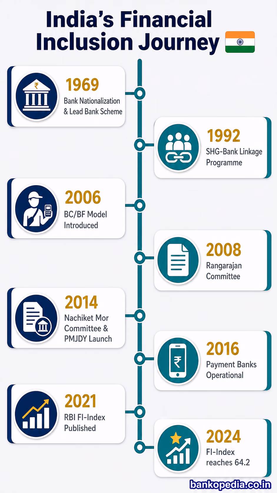 The journey of financial inclusion in India did not begin in the 21st century. It has roots in the nationalization of banks (1969 and 1980) and the introduction of the Lead Bank Scheme (1969). However, the modern, targeted approach to financial inclusion was shaped by key RBI committees.