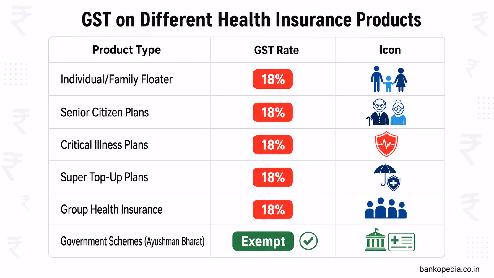 Group Health Insurance (Employer-Employee): 18% GST. While purchased by corporate entities, the underlying tax rate remains the same.